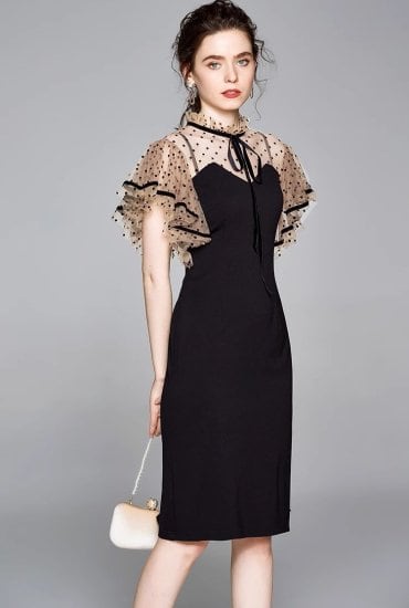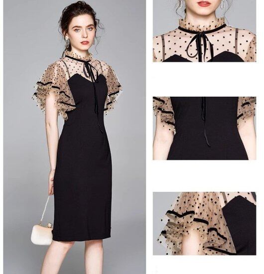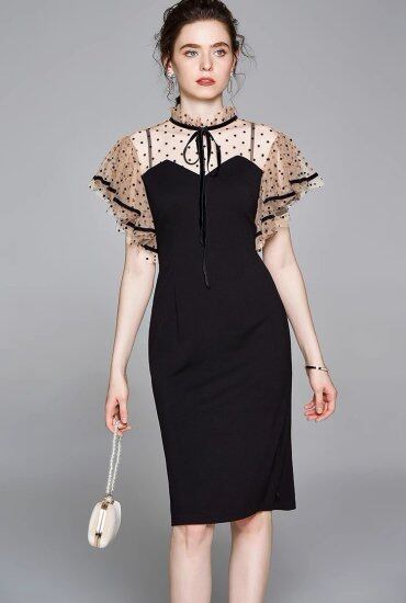 結婚式ドレス レディース タイトワンピース ドット柄 水玉 フリルスリーブ ラッフルフリル フリルネック リボン ミディアム丈 ひざ丈 半袖 演奏会 二次会 披露宴 謝恩会 パーティー おしゃれ