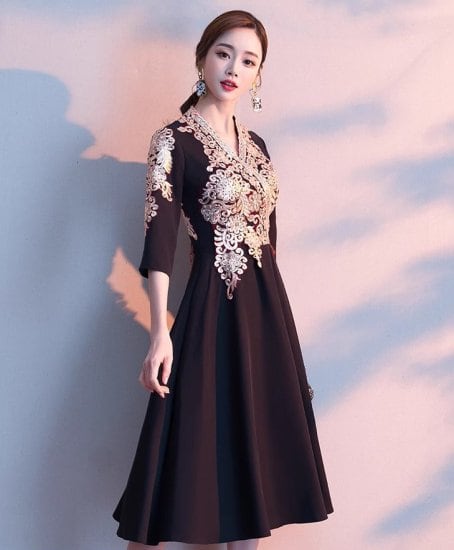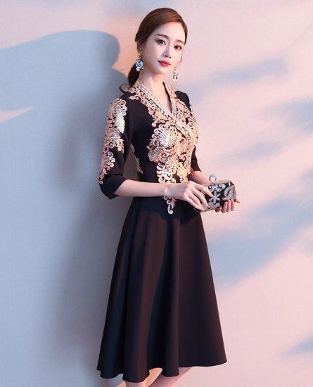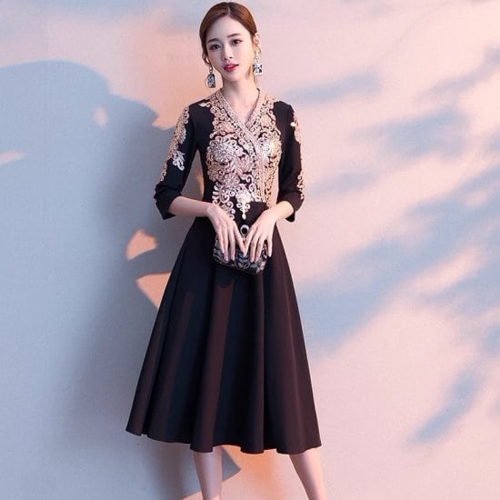 結婚式ドレス レディース Vネック 刺繍 フレアワンピース 七分袖 長袖 カシュクール チャイナ風 ミディアム丈 ミモレ丈 演奏会 披露宴 ステージ衣装 パーティー イブニングドレス おしゃれ