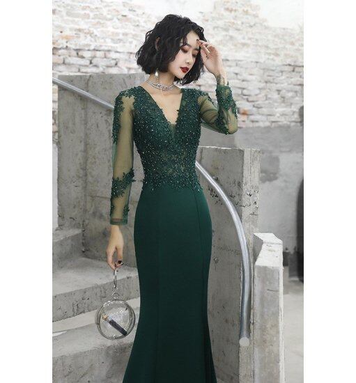 演奏会ドレス レディース Vネック ロングドレス マーメイド 長袖 シアースリーブ レース スリム タイト ビジュー 結婚式 カラードレス 二次会 披露宴 パーティー イブニングドレス エレガント