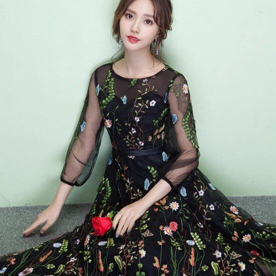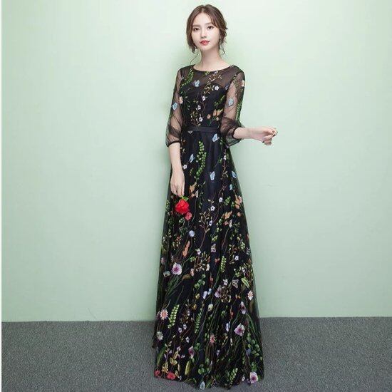 結婚式ドレス レディース 花柄 ロングドレス レース 刺繍 透け感 シアースリーブ 七分袖 ボタニカル マキシ丈 演奏会 二次会 披露宴 ステージ衣装 謝恩会 パーティードレス 華やか エレガント