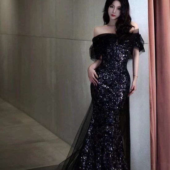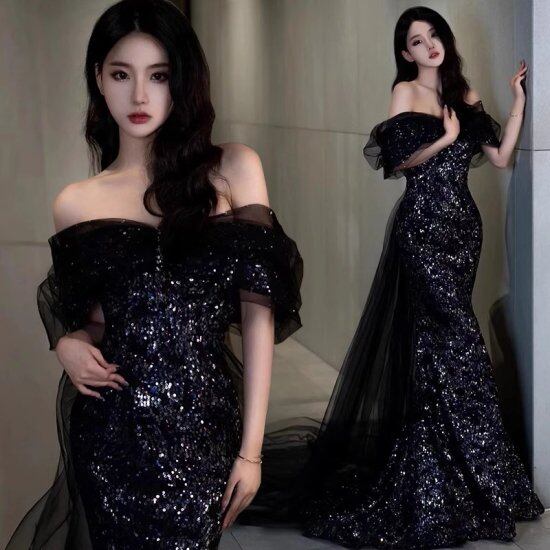 ウェディングドレス レディース オフショルダー マーメイド フィッシュテール 肩出し スパンコール マキシ丈 スリム 黒 演奏会 披露宴 ステージ衣装 パーティー イブニングドレス エレガント