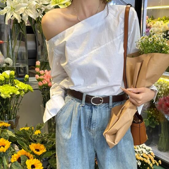 長袖ブラウス レディース シャツ ブラウス トップス ワンショルダー アシンメトリー 白 ホワイト 長袖 カジュアル お出かけ おしゃれ シンプル 無地 春夏 ルーズ 長袖シャツファッション 肩出し