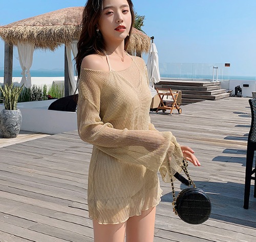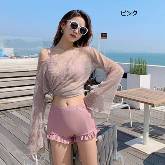 ビキニ レディース 水着 3点セット スリーピース メッシュトップス付き カバーアップ シースルー ラッシュガード UV対策 日焼け対策 ホルターネック フリル 海 プール ビーチ 海水浴 リゾート