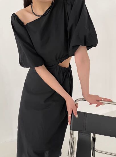 ロングワンピース レディース ワンピース 半袖ワンピース ワンショルダー オフショルダー パフスリーブ ハイウエスト アシンメトリー ウエスト開き 肌見せ カジュアル お出かけ シンプル 無地 女性