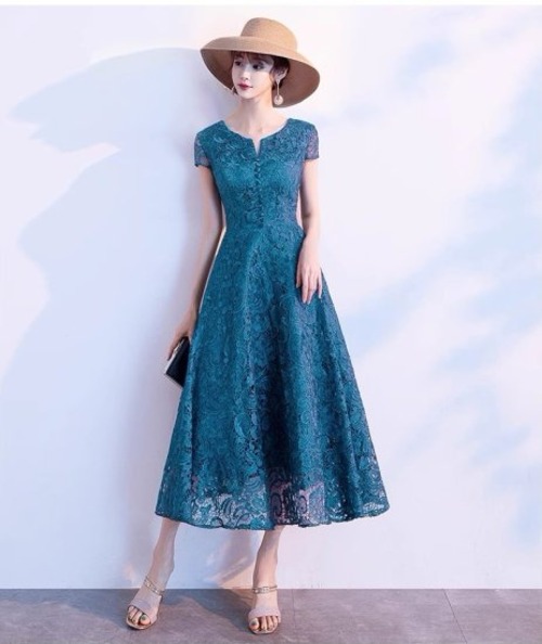結婚式ドレス レディース レースワンピース 半袖 キーネック フレアワンピース 総レース ミモレ丈 ロング丈 Aライン 演奏会 二次会 披露宴 謝恩会 パーティードレス 上品 華やか エレガント