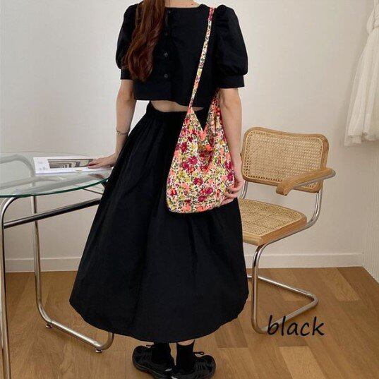 ワンピース ロングスカート パフスリーブ バックオープン 背中あき お出かけ カジュアル ミモレ丈 体型カバー 上品 無地 シンプル かわいい 半袖 ラウンドネック クール おしゃれ Aライン