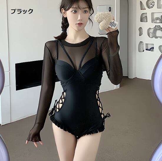 ワンピース水着 レディース 水着 ラッシュガード 2点セット UV対策 日焼け対策 メッシュトップス 長袖トップス フリル 細ストラップ サイドレースアップ 海 プール ビーチ 海水浴 リゾート