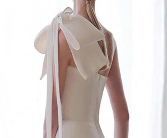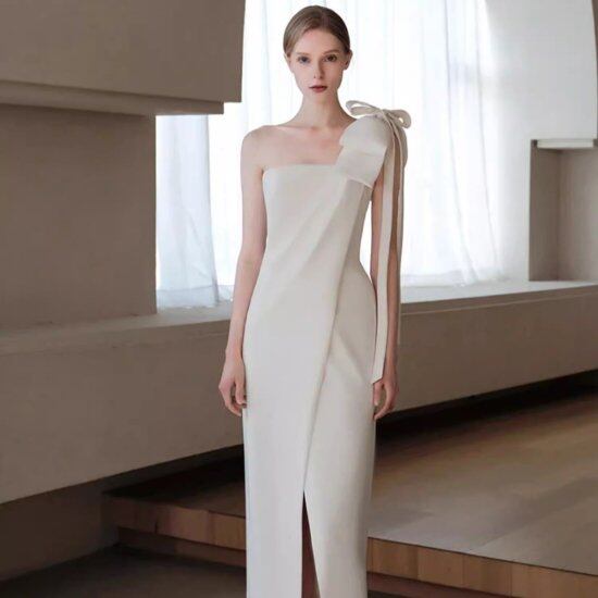 パーティードレス レディース ウェディングドレス ワンショルダー リボン タイト スリム スリット ミモレ丈 ロング丈 白 肩出し シンプル 無地 結婚式 演奏会 イブニングドレス エレガント