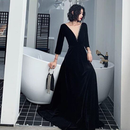 結婚式ドレス レディース Vネック 背中あき ビーズ 七分袖 長袖 ベルベット ベロア ロングドレス マキシ丈 演奏会 二次会 披露宴 ステージ衣装 パーティー イブニングドレス 上品 エレガント