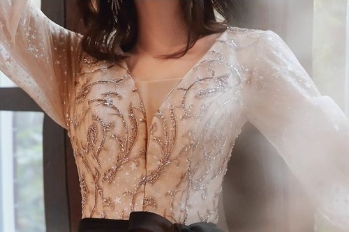演奏会ドレス レディース 結婚式ドレス ロングドレス 長袖 パフスリーブ Vネック 星 ビーズ マキシ丈 ウエストリボン ゴージャス 披露宴 ステージ衣装 パーティー イブニングドレス おしゃれ