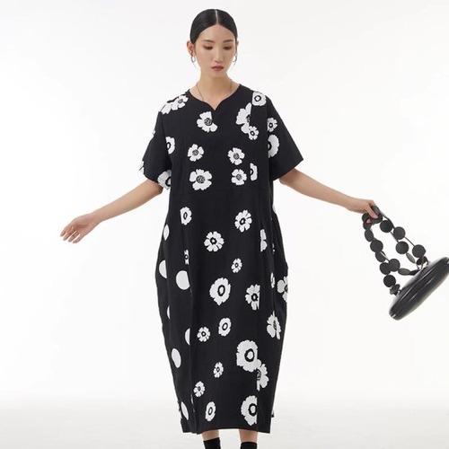 プリントワンピース レディース 花柄 フラワープリント ドット柄 水玉 半袖 五分袖 七分袖 ミモレ丈 ゆったり ロングワンピース コットン かわいい カジュアル 花柄ワンピース おしゃれ 個性的