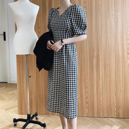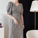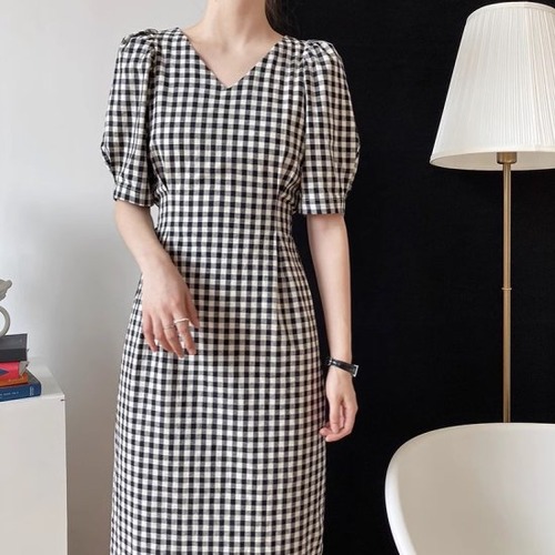 Vネックワンピース レディース ギンガムチェック パフスリーブ 半袖 タイトワンピース チェック柄 ミモレ丈 ロング丈 レトロ クラシカル きれいめ カジュアル おでかけ オフィス おしゃれ