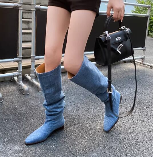 ロングブーツ レディース ブーツ 靴 シューズ デニムブーツ ローヒール 太ヒール チャンキーヒール シンプル 無地 カジュアル お出かけ おしゃれ 履きやすい 歩きやすい 疲れにくい ファッション