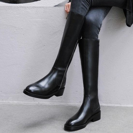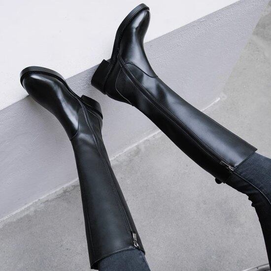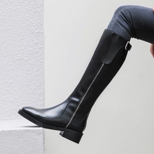 ロングブーツ レディース ベルト レザー ロング丈 サイドファスナー ローヒール 4.5cmヒール ラウンドトゥ 太ヒール メンズライク マニッシュ クール カジュアル きれいめ 靴 おしゃれ
