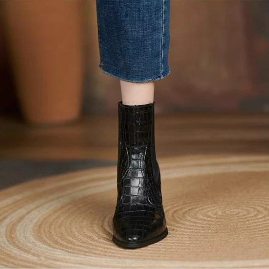 ショートブーツ レディース サイドゴア 型押し スネーク パイソン アニマル柄 ポインテッドトゥ ショート丈 6.5cmヒール 太ヒール 歩きやすい きれいめ カジュアル 美脚 脚長 靴 おしゃれ