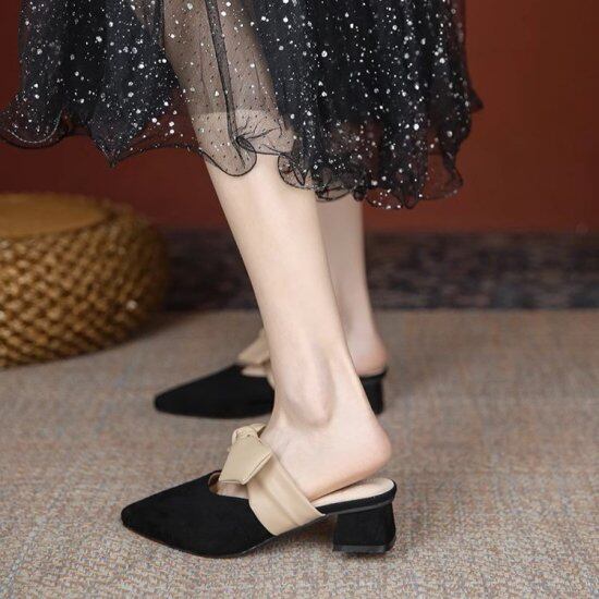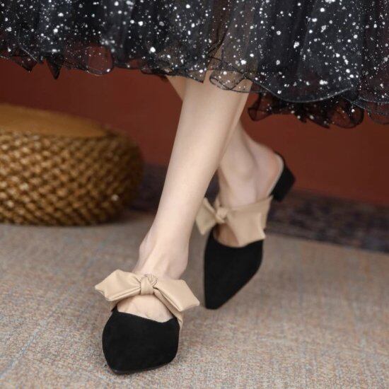 リボンミュール レディース サンダル ポインテッドトゥ リボンストラップ ローヒール 太ヒール 3.5cmヒール ストラップサンダル かわいい きれいめ 上品 エレガント パーティー おしゃれ