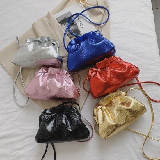 バッグ レディース ショルダーバッグ ポーチ シャーリング 巾着バッグ ミニバッグ 光沢 無地 ゴージャス 斜め掛け シルバー ゴールド かわいい きれいめ 華やか 旅行 パーティー おしゃれ