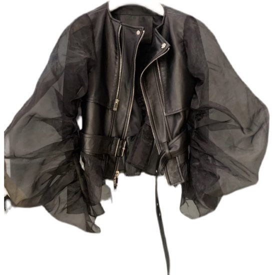 ジャケット レディース レザージャケット 異素材MIX 個性的 ノーカラー ボリュームスリーブ レース オーガンジー 透け感 シアースリーブ シースルー ショート丈ジャケット カジュアル おしゃれ