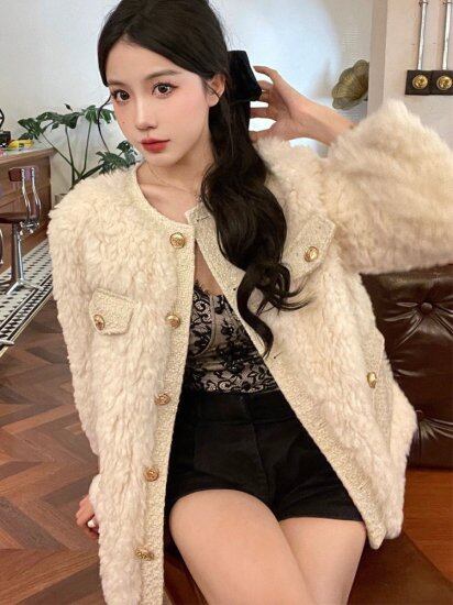 コート レディース 大きいサイズ レギュラー丈 ミディアム丈 もこもこ モコモコ 長袖 ラウンドネック ボタン ポケット 無地 シンプル オフホワイト 通勤 デート 女子会 お出かけ 20代 秋冬