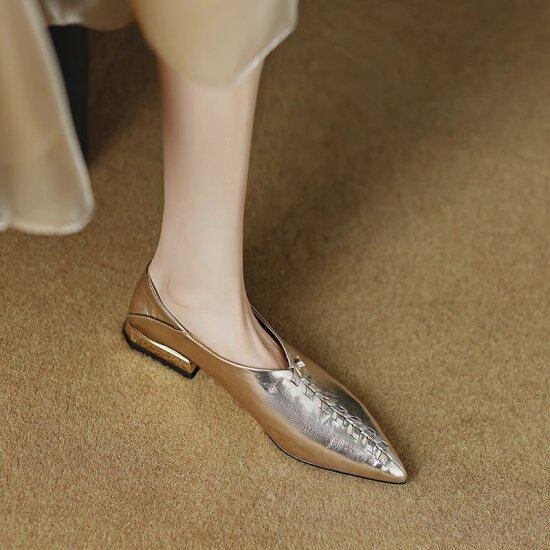 パンプス レディース ポインテッドトゥ フラットパンプス ローヒール 1cmヒール 編み込み ぺたんこ フェイクレザー エコレザー スリッポン ゴールド きれいめ レトロ クラシカル おしゃれ