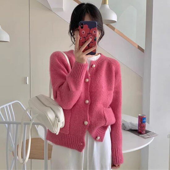 カーディガン レディース ニット セーター ラウンドネック 長袖 パールボタン ポケット レトロ クラシカル 無地 ゆったり 5color かわいい ガーリー カジュアル おでかけ デート おしゃれ