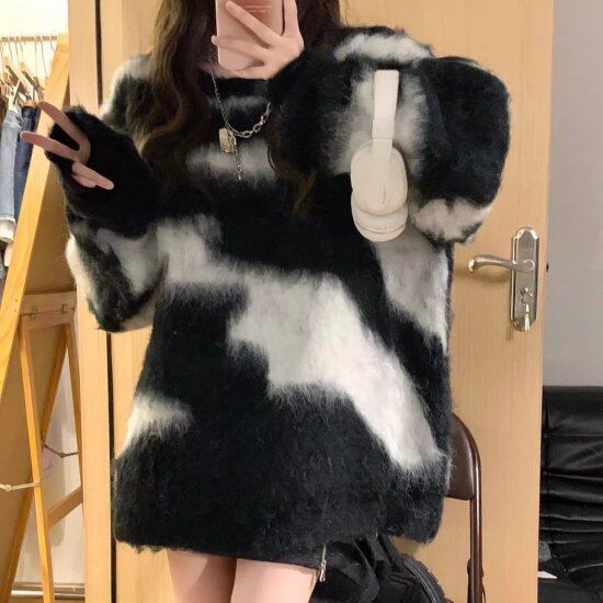 ニット レディース セーター ゼブラ柄 長袖 オーバーサイズ ビッグシルエット アニマル柄 ラウンドネック ボリューム袖 ロングニット ロングセーター 個性的 カジュアルコーデ ストリート おしゃれ