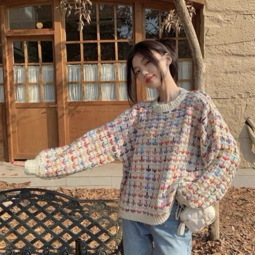ニット レディース セーター チェック ラウンドネック 長袖 オーバーサイズ ざっくり 編み込み ミディアム丈 ゆったり ミックスカラー レトロ クラシック かわいい カジュアル おしゃれ