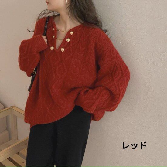 ロングニット レディース Vネック チュニック ロングセーター プルオーバー ボリューム袖 チェーン ゆったり ざっくり 編み 9color かわいい きれいめ カジュアル あたたか おしゃれ