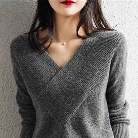 ニット レディース Vネックセーター カシュクール 長袖 無地 シンプル スリム クレー Vネックニット ウールタッチ シャープ シック きれいめ 上品 カジュアル オフィスコーデ おしゃれ