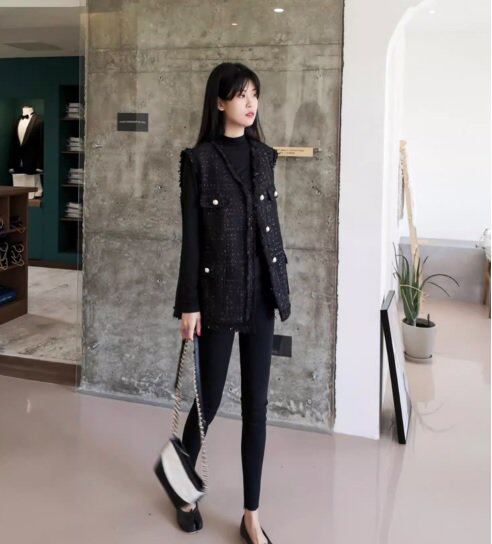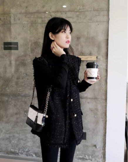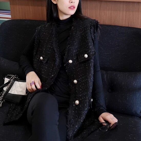 ベスト ジレ ツイード素材 レデイース Vネック ブラック フリンジ付き おしゃれ 丈長め 体型カバー レディース ツイード素材 ベスト Vネック ベスト フリンジ かわいい 秋 ベスト・ジレ