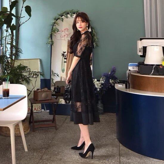 結婚式ドレス レディース レースワンピース ハイネック バックリボン 透け感 シアー シースルー 半袖 メッシュ ミディアム丈 きれいめ エレガント 演奏会ドレス 二次会 パーティー おしゃれ