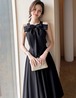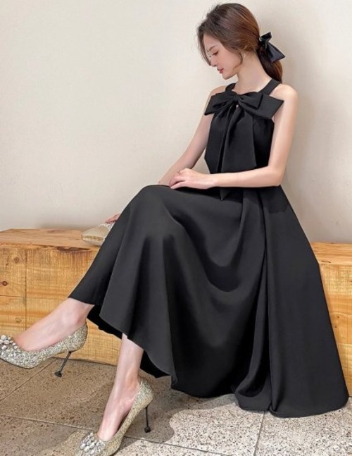 パーティードレス レディース リボン ホルターネック ノースリーブワンピース Aライン ミモレ丈 ミディアム丈 ロング丈 無地 ブラック エレガント 結婚式 演奏会 二次会 謝恩会 おしゃれ