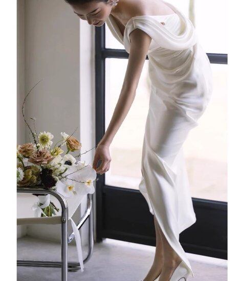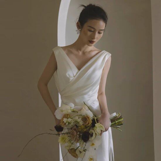 ウェディングドレス レディース Vネック ロングドレス カシュクール スリット マーメイド ノースリーブ マキシ丈 シンプル 白 エレガント 結婚式 演奏会 ブライダル ステージ衣装 おしゃれ