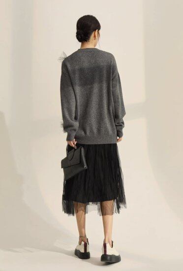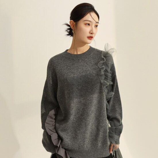 ニット レディース 大きいサイズ セーター レース フリル レギュラー丈 ミディアム丈 グレー 長袖 フリーサイズ ラウンドネック 無地 シンプル 通勤 デート 女子会 お出かけ 韓国 20代 秋冬