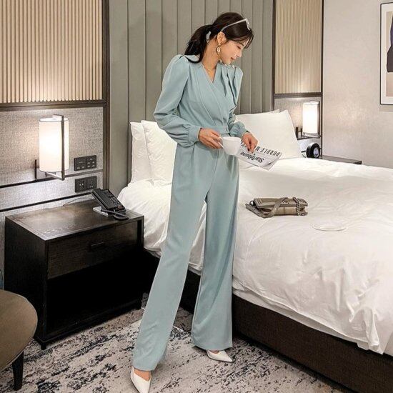 パンツドレス レディース オールインワン Vネック カシュクール ワイドパンツ ジャンプスーツ ハイウエスト 長袖 パフスリーブ ドレープ レトロ クラシカル きれいめ パーティー おしゃれ