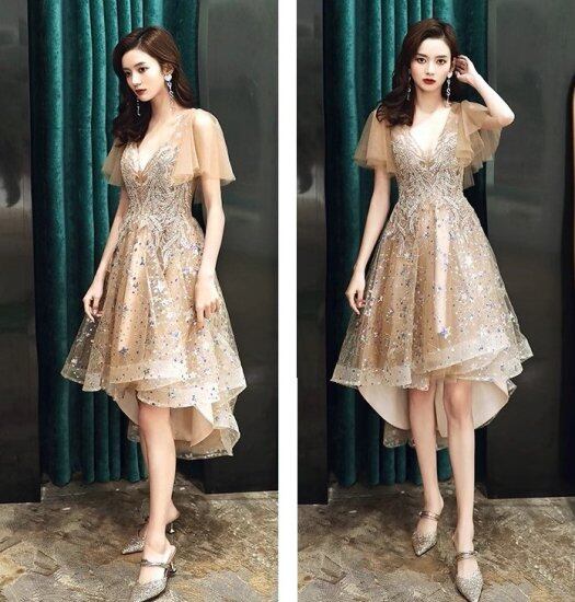 パーティードレス レディース Vネックワンピース スパンコール レース袖 フィッシュテール ドレス 半袖 チュール袖 ゴージャス 星柄 華やか エレガント 演奏会 ステージ衣装 結婚式 おしゃれ