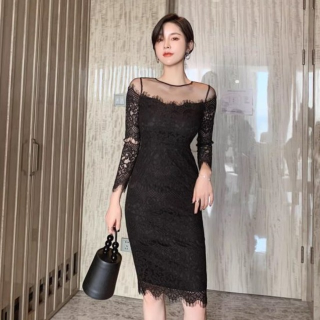 パーティードレス レディース レースワンピース 長袖 タイトワンピース 総レース 透け感 シースルー ひざ丈 ミディア ム丈 エレガント 結婚式 演奏会 二次会 謝恩会 パーティー おしゃれ