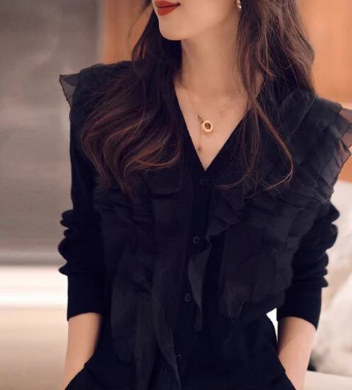 ニットセーター レディース トップス ニット セーター 長袖 Vネック フリル ボタン ウール オーガンジー きれいめ エレガント フェミニン カジュアル お出かけ おしゃれ ファッション ブラック