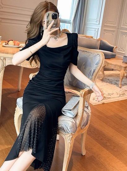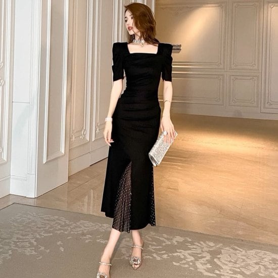 結婚式ドレス レディース マーメイド ワンピース 半袖 スクエアネック パフスリーブ ミモレ丈 ロング丈 タイトワンピース レース エレガント 演奏会 二次会 謝恩会 パーティードレス おしゃれ