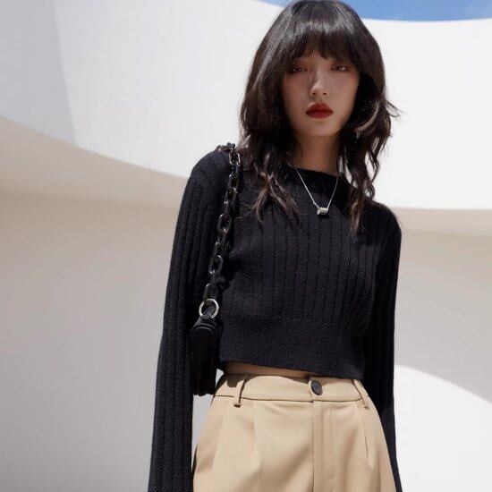 ニットセーター レディース クロップドニット ショート丈 長袖 ラウンドネック リブニット 肌見せ 無地 スタイルアップ 脚長 レトロ クロップドセーター かわいい ガーリー カジュアル おしゃれ