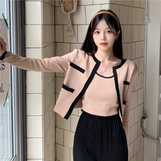 ニットアンサンブル レディース セットアップ カーディガン キャミソール 2点セット バイカラー 配色ニット ツーピース 長袖 ノースリーブ コンサバ きれいめ 上品 オフィス おでかけ おしゃれ