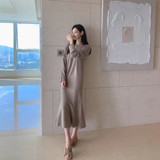 ニットワンピース レディース マーメイド ロングワンピース 長袖 ラウンドネック 裾フリル Aライン ミモレ丈 ロング丈 フェミニン きれいめ エレガント シック おでかけ オフィス おしゃれ