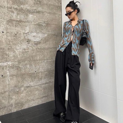 ニットカーディガン レディース ニットシャツ 長袖 ポロ襟 ボタン プルオーバー 総柄 薄手 羽織り バイカラー 迷彩 アニマル トライバル ミディアム丈 個性的 モード カジュアル おしゃれ