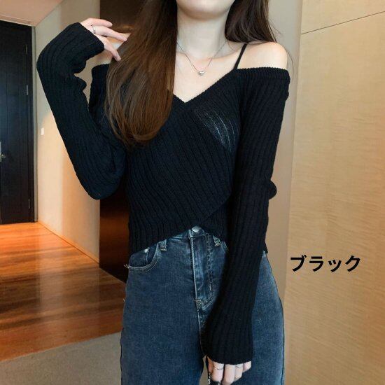 オフショルダーニット レディース Vネック クロス ニット ショルダーストラップ 長袖 無地 ショート丈 クロップド丈 肩出し 肌見せ 薄手 かわいい ガーリー カジュアル 4color おしゃれ