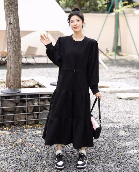 ロングワンピース レディース ティアードワンピース スウェット 長袖 ラウンドネック 無地 ロング丈 Aラインワンピース プリンセス ボリューム あたたか 厚手 カジュアル かわいい おしゃれ
