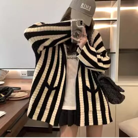 ニットカーディガン レディース カーディガン 羽織 パーカー フード付き 長袖 バイカラー コントラストカラー ストライプ カジュアル お出かけ おしゃれ ゆったり ルーズ ミドル丈 ファッション
