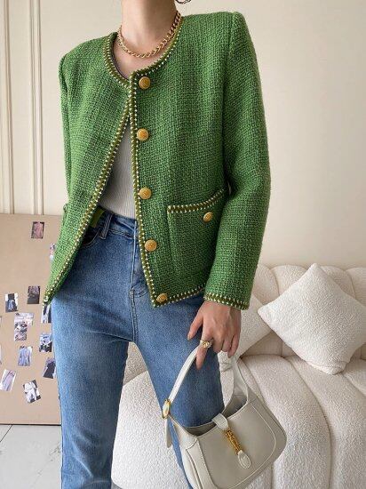 ツイードジャケット レディース ノーカラージャケット ショート丈 長袖 ラウンドネック ゴールドボタン 緑 グリーン レトロ クラシカル きれいめ 上品 エレガント オフィス オケージョン おしゃれ