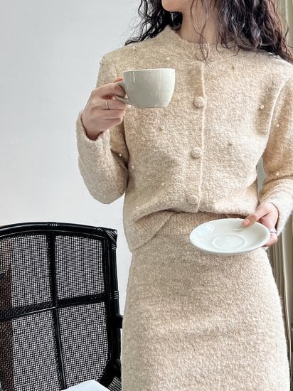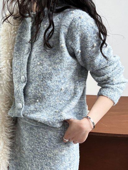 セットアップ レディース ニット ツーピース パール付き セーター カーディガン 長袖 ラウンドネック ニットスカート ミニスカート Aライン 2点セット かわいい きれいめ カジュアル おしゃれ