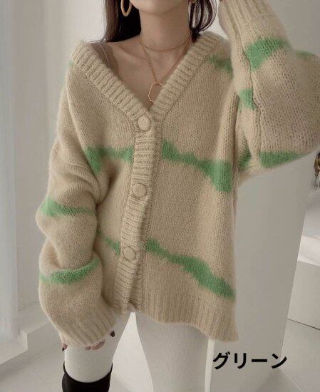 ニットカーディガン レディース Vネック ボーダー 長袖 オーバーサイズ 羽織り ゆったり ゆるニット ルーズ ミディアム丈 レトロ かわいい ガーリー カジュアル カーディガン おしゃれ