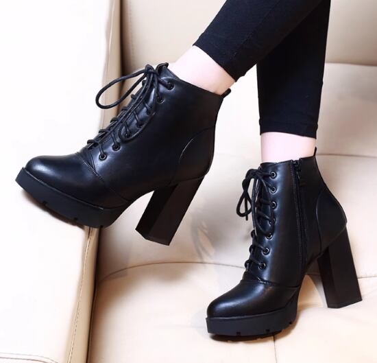 ショートブーツ レディース ブーツ 靴 シューズ レースアップ 編み上げブーツ ハイヒール 太ヒール チャンキーヒール サイドジッパー 美脚 脚長 黒 ブラック 10cmヒール カジュアル お出かけ
